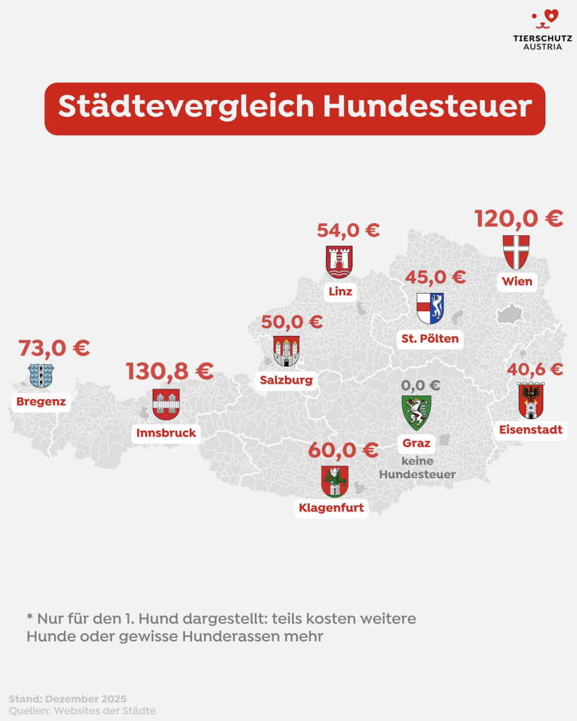 In Österreich können rund 2.000 Gemeinden eigene Hundesteuersätze festlegen – das führt zu erheblichen regionalen Unterschieden. Während Hunde in Graz steuerfrei bleiben, liegt die Abgabe in Innsbruck bei bis zu 130,80 Euro. Wien plant nun eine der höchsten Steuern des Landes mit 120 Euro.